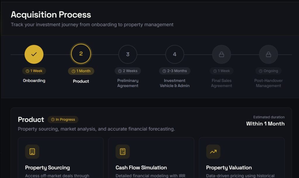 Our platform gives clients full visibility over each stage of their investment journey. Every step is clearly identified, with real-time status updates and actionable to-do lists.